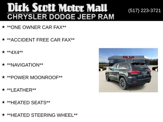 **ONE OWNER CAR FAX**, **ACCIDENT FREE CAR FAX**, **4X4**, **NAVIGATION**, **POWER MOONROOF**, **LEATHER**, **HEATED SEATS**, **HEATED STEERING WHEEL**, Grand Cherokee Altitude, 4D Sport Utility, 3.6L V6 24V VVT, 8-Speed Automatic, 4WD, Diamond Black Crystal Pearlcoat, Black Leather, 1-Year SiriusXM Radio Service, 1-Yr SiriusXM Guardian Trial, 115V Auxiliary Power Outlet, 4-Wheel Disc Brakes, 4G LTE Wi-Fi Hot Spot, 5-Year SiriusXM Traffic Service, 5-Year SiriusXM Travel Link Service, 8.4" Touchscreen Display, ABS brakes, Altitude Grille, Altitude IV Package, Apple CarPlay, Auto-Dimming Rear-View Mirror, Black Suede Seats w/Black Stitching, Body Color Claddings, Body Color Fascia, Body Color Shark Fin Antenna, Dark Day Light Opening Moldings, Dark Headlamp Bezel Finish, Dark Lens Taillamps, Front Accent/Body Color Fascia, Gloss Black Rear Fascia Applique, Google Android Auto, GPS Antenna Input, GPS Navigation, HD Radio, Instrument Cluster w/Off-Road Disp. Pages, Integrated Center Stack Radio, Integrated Voice Command w/Bluetooth, Jeep Black Gloss Badging, Power 4-Way Driver Lumbar Adjust, Power 8-Way Driver/Manual Passenger Seat, Power Liftgate, Quick Order Package 2BZ Altitude, Radio: Uconnect 4C Nav w/8.4" Display, Rear Accent/Body Color Fascia, Rear Fascia Black MIC Step Pad, Security & Convenience Group, Security Alarm, Single Exhaust w/Bright Tip, SiriusXM Satellite Radio, SiriusXM Traffic Plus, SiriusXM Travel Link, Steering Wheel Mounted Audio Controls, Universal Garage Door Opener, USB Host Flip, Wheels: 20" x 8.0" Gloss Black Aluminum.