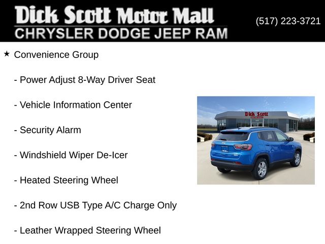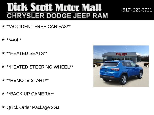 **ACCIDENT FREE CAR FAX**, **4X4**, **HEATED SEATS**, **HEATED STEERING WHEEL**, **REMOTE START**, **BACK UP CAMERA**, Compass Latitude, 4D Sport Utility, 2.4L I4, 9-Speed 948TE Automatic, 4WD, Laser Blue Pearlcoat, Black Cloth, 115V Auxiliary Power Outlet, 2nd Row USB Type A/C Charge Only, 4-Wheel Disc Brakes, ABS brakes, Air Conditioning ATC w/Dual Zone Control, All-Season Floor Mats, Auto-Dimming Rear-View Mirror, Convenience Group, Foot Activated Open 'N Go Liftgate, Heated Front Seats, Heated Steering Wheel, Humidity Sensor, Leather Wrapped Steering Wheel, Power Adjust 8-Way Driver Seat, Power Liftgate, Quick Order Package 2GJ, Remote Start System, Reversible Carpet/Vinyl Cargo Mat, Security Alarm, Universal Garage Door Opener, Vehicle Information Center, Windshield Wiper De-Icer. 22/30 City/Highway MPG
