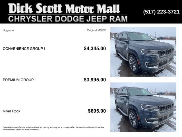 Recent Arrival! **ONE OWNER CAR FAX**, **ACCIDENT FREE CAR FAX**, **4X4**, **NAVIGATION**, **POWER MOONROOF**, **LEATHER**, **HEATED SEATS**, **REMOTE START**, **BACK UP CAMERA**, Wagoneer Series II, 4D Sport Utility, 3.0L I6, 8-Speed Automatic, 4WD, River Rock, Black Leather, 2nd Row Manual Window Shades, 3 Panel Sunroof, 4-Wheel Disc Brakes, ABS brakes, Adjustable Roof Rail Crossbars, Auto High Beam Headlamp Control, Cargo Cover, Convenience Group I, Drowsy Driver Detection, Heads-Up Display, Intersection Collision Assist System, Navigation System, P&P Park & Unpark Assist w/Stop System, Power Liftgate, Premium Group I, Quick Order Package 25J, Reversible Carpet/Vinyl Cargo Mat, Side Distance Warning, Surround View Camera System, Traffic Sign Recognition.